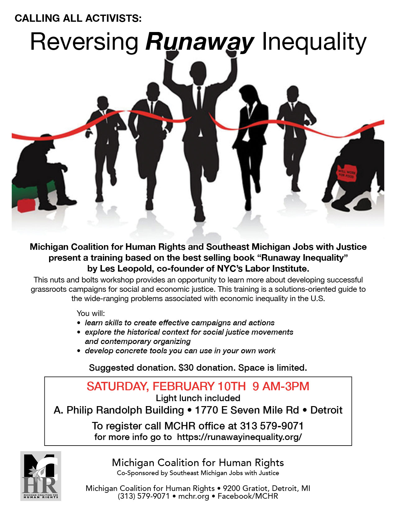 Michigan Coalition For Human Rights and Southeast Michigan Jobs with Justice present a training based on the best selling book “Runaway Inequality” by Les Leopold, co-founder of NYC’s Labor Institute.