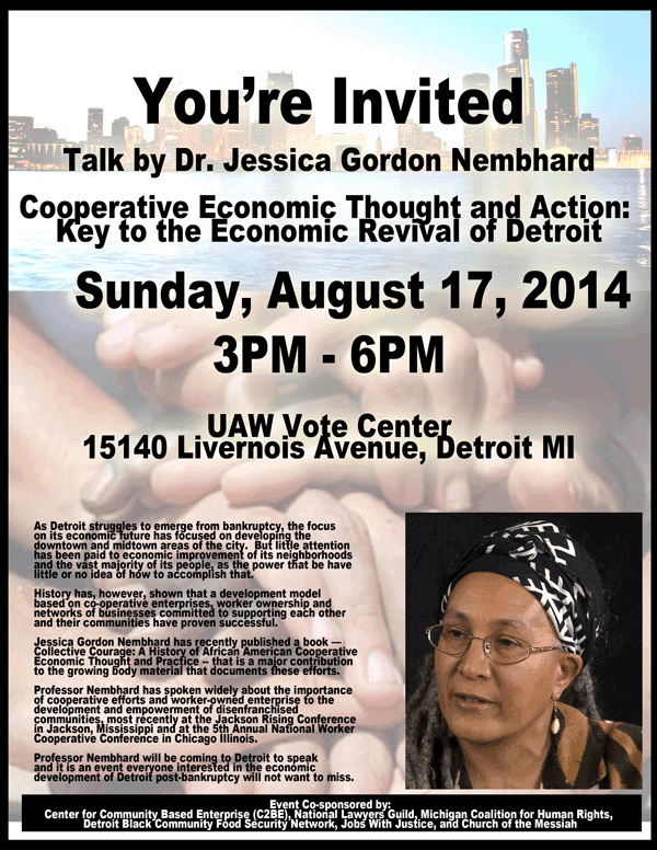 The Center for Community Based Enterprise, along with MCHR, is co-sponsoring a talk by Dr. Jessica Gordon Nembhard on 8/17.The Dr. Nembhard recently published “Collective Courage: A History of African American Cooperative Economic Thought and Practice”, and will be speaking about the role of cooperatives in the revival of Detroit’s economy. Representatives of Detroit areas co-operatives will also talk about their co-op efforts. We’re proud to be involved in this event, and hope you will attend.