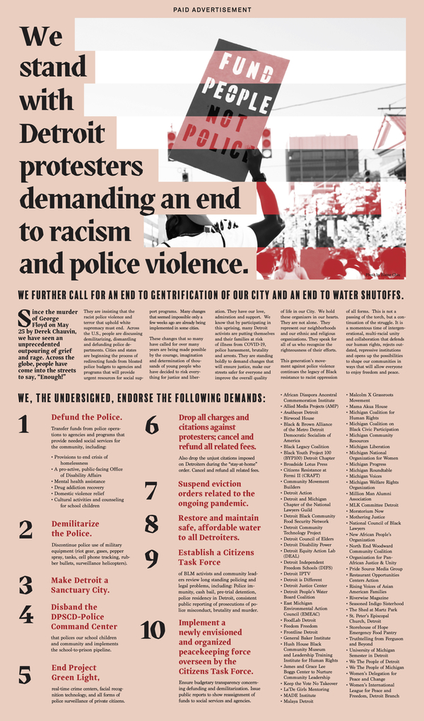 The full-page ad, which also listed the demands of the protestors, was published in the Detroit Free Press.